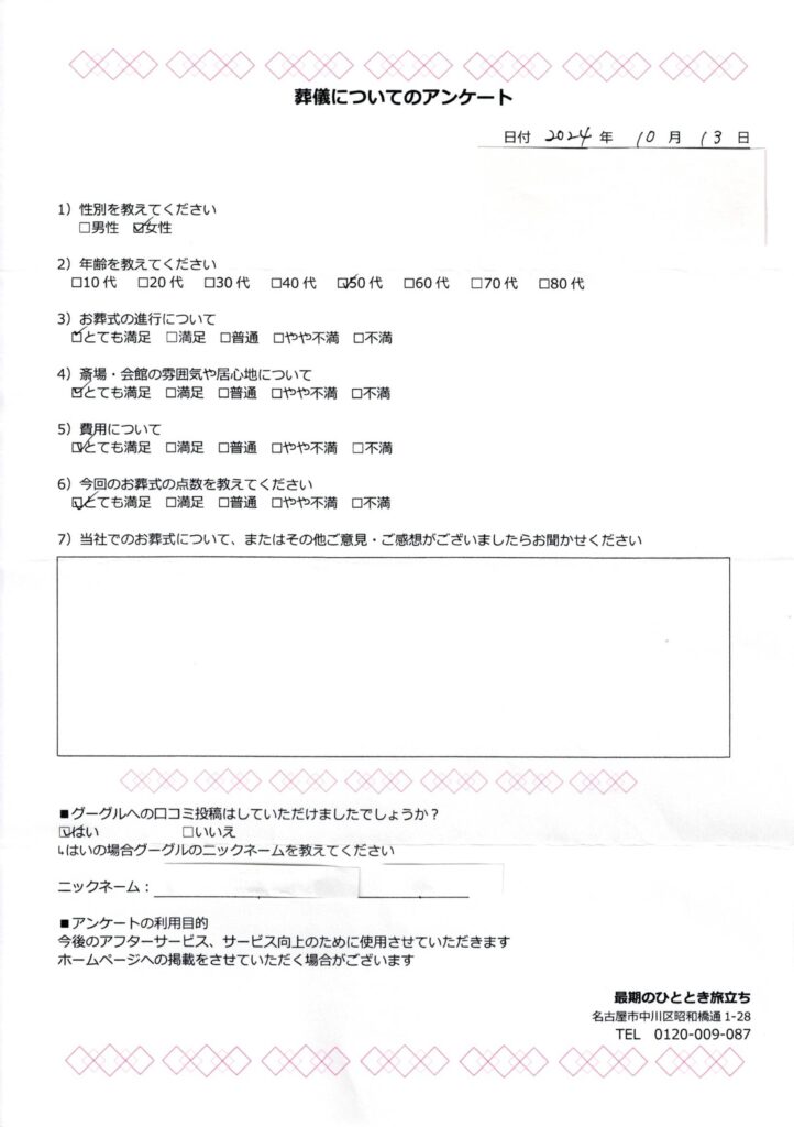 お客様の声 2025/04/15 【中村区】50代女性 無料で今すぐ相談する 葬儀・家族葬に関する疑問やお悩みは、お気軽にご相談ください。 ご相談・お問合わせ・お見積もりは無料です。 最期のひととき旅立ちまでお気軽にお問い合わせください。 葬儀・家族葬のご相談はこちら >> 無料で今すぐ相談する 葬儀・家族葬に関する疑問やお悩みは、お気軽にご相談ください。 ご相談・お問合わせ・お見積もりは無料です。 最期のひととき旅立ちまでお気軽にお問い合わせください。 葬儀・家族葬のご相談はこちら >> ≪ひとつ古い記事へ ひとつ新しい記事へ≫