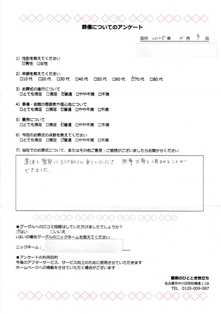 遺体を警察に引き取りに来ていただき、無事火葬をすませることが