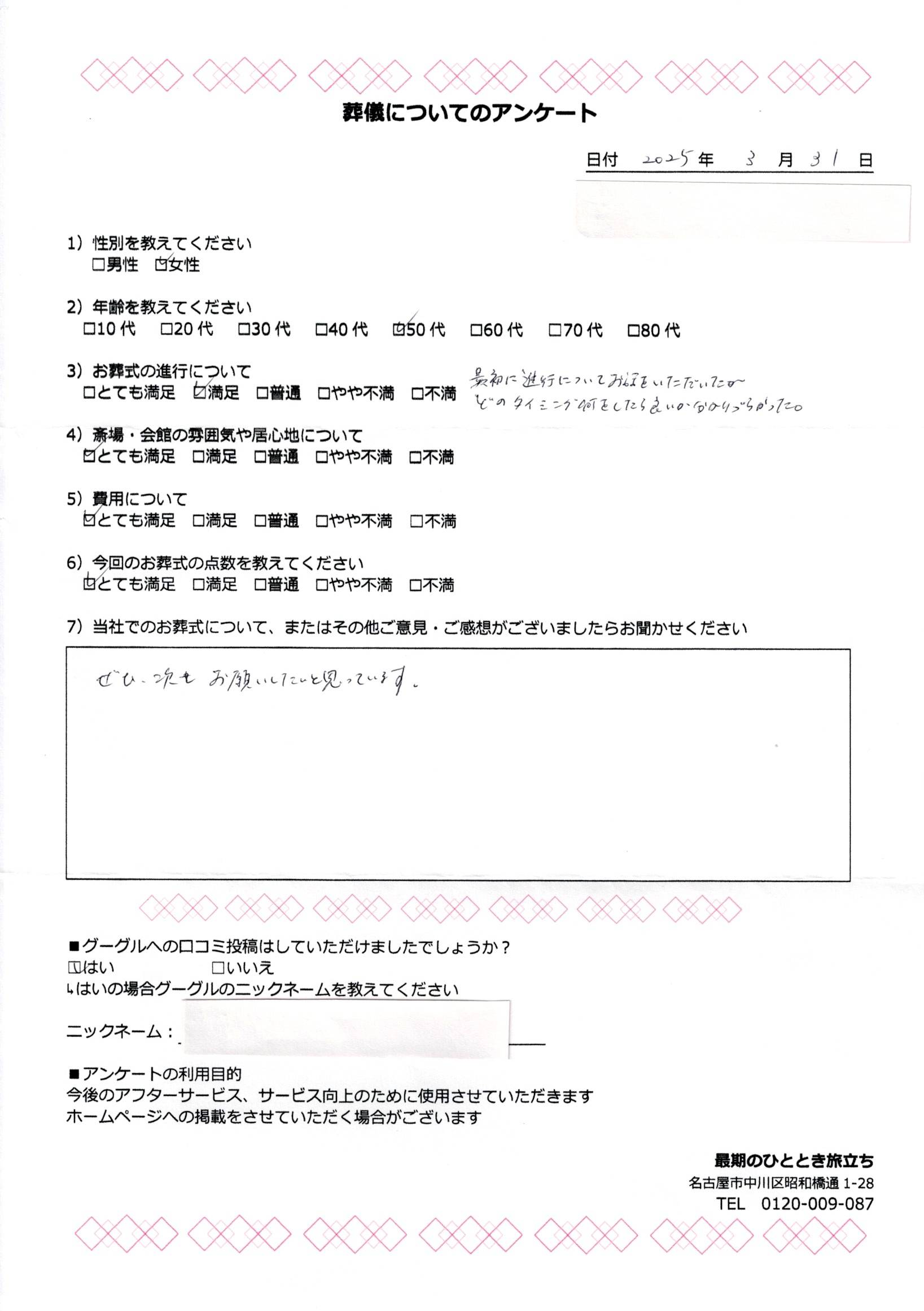 2025/04/29 52【中川区】50代女性 無料で今すぐ相談する 葬儀・家族葬に関する疑問やお悩みは、お気軽にご相談ください。 ご相談・お問合わせ・お見積もりは無料です。 最期のひととき旅立ちまでお気軽にお問い合わせください。 葬儀・家族葬のご相談はこちら >> 無料で今すぐ相談する 葬儀・家族葬に関する疑問やお悩みは、お気軽にご相談ください。 ご相談・お問合わせ・お見積もりは無料です。 最期のひととき旅立ちまでお気軽にお問い合わせください。 葬儀・家族葬のご相談はこちら >> ≪ひとつ古い記事へ