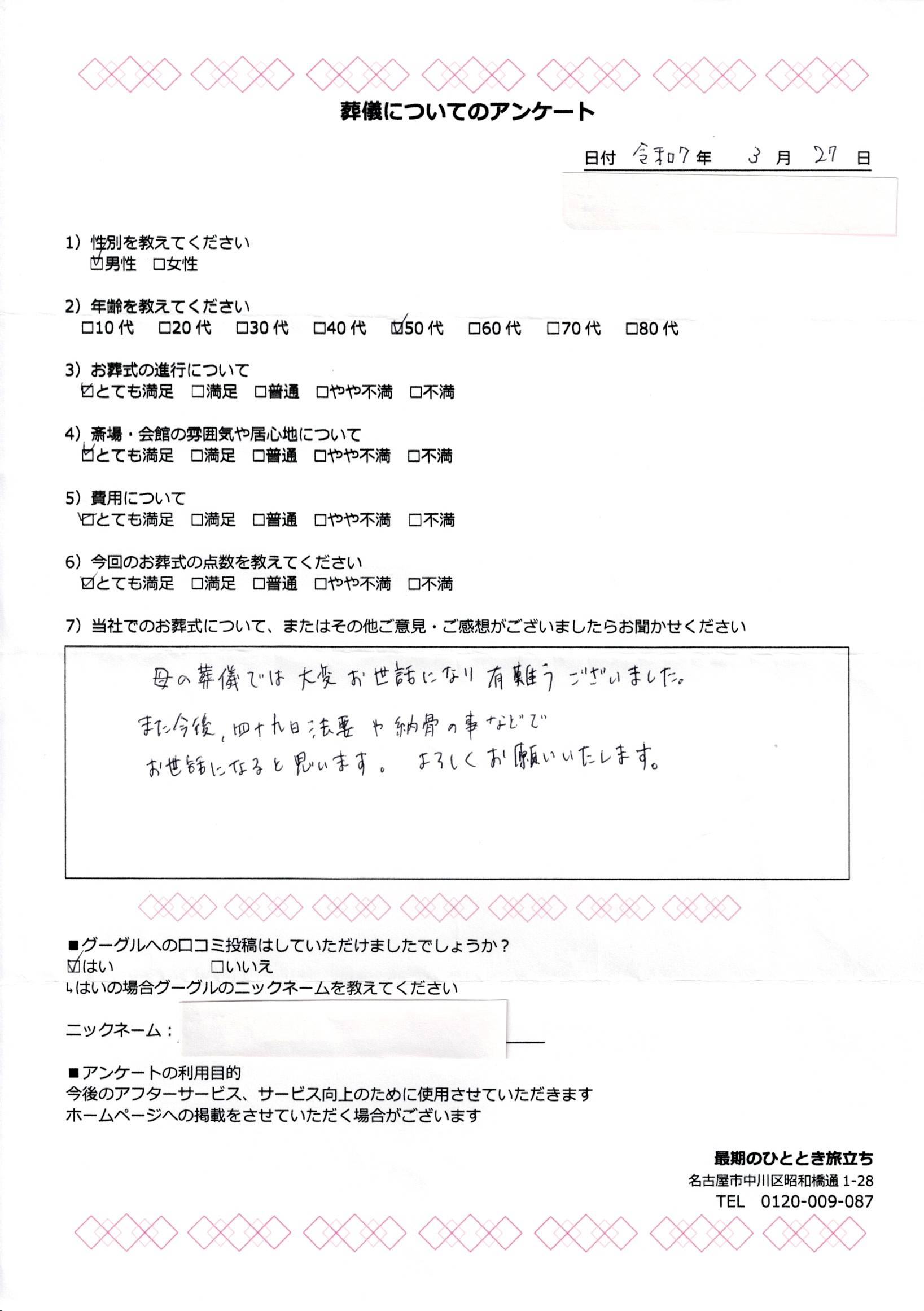 2025/04/29 51【中川区】50代男性 無料で今すぐ相談する 葬儀・家族葬に関する疑問やお悩みは、お気軽にご相談ください。 ご相談・お問合わせ・お見積もりは無料です。 最期のひととき旅立ちまでお気軽にお問い合わせください。 葬儀・家族葬のご相談はこちら >> 無料で今すぐ相談する 葬儀・家族葬に関する疑問やお悩みは、お気軽にご相談ください。 ご相談・お問合わせ・お見積もりは無料です。 最期のひととき旅立ちまでお気軽にお問い合わせください。 葬儀・家族葬のご相談はこちら >> ≪ひとつ古い記事へ