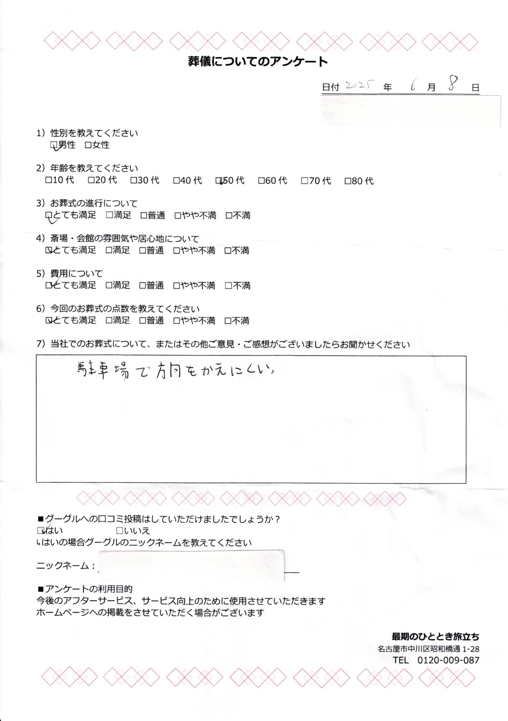 2025/06/17 64【中川区】50代男性 無料で今すぐ相談する 葬儀・家族葬に関する疑問やお悩みは、お気軽にご相談ください。 ご相談・お問合わせ・お見積もりは無料です。 最期のひととき旅立ちまでお気軽にお問い合わせください。 葬儀・家族葬のご相談はこちら >> 無料で今すぐ相談する 葬儀・家族葬に関する疑問やお悩みは、お気軽にご相談ください。 ご相談・お問合わせ・お見積もりは無料です。 最期のひととき旅立ちまでお気軽にお問い合わせください。 葬儀・家族葬のご相談はこちら >> ≪ひとつ古い記事へ