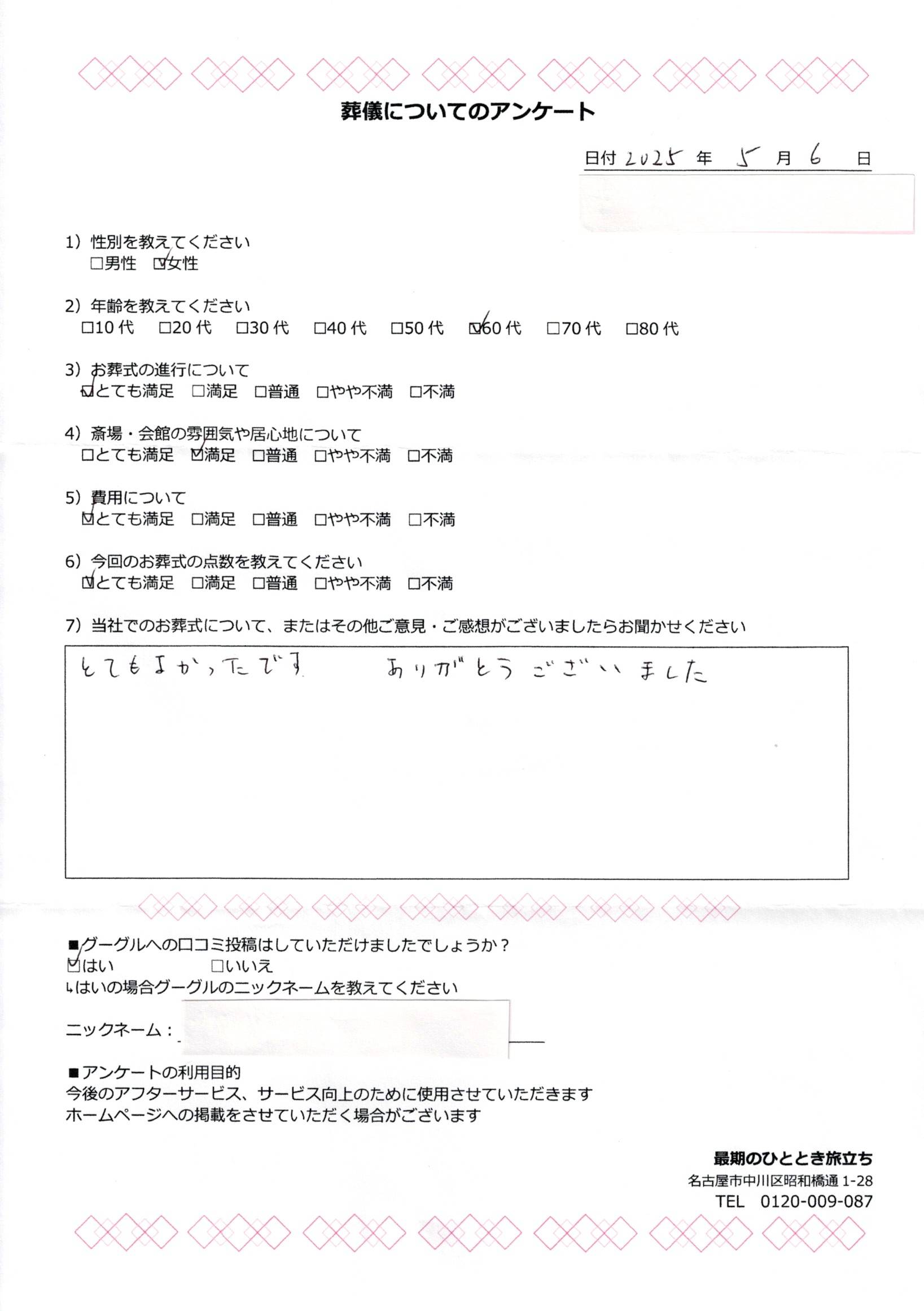 2025/05/13 60【北名古屋市】60代女性 無料で今すぐ相談する 葬儀・家族葬に関する疑問やお悩みは、お気軽にご相談ください。 ご相談・お問合わせ・お見積もりは無料です。 最期のひととき旅立ちまでお気軽にお問い合わせください。 葬儀・家族葬のご相談はこちら >> 無料で今すぐ相談する 葬儀・家族葬に関する疑問やお悩みは、お気軽にご相談ください。 ご相談・お問合わせ・お見積もりは無料です。 最期のひととき旅立ちまでお気軽にお問い合わせください。 葬儀・家族葬のご相談はこちら >> ≪ひとつ古い記事へ
