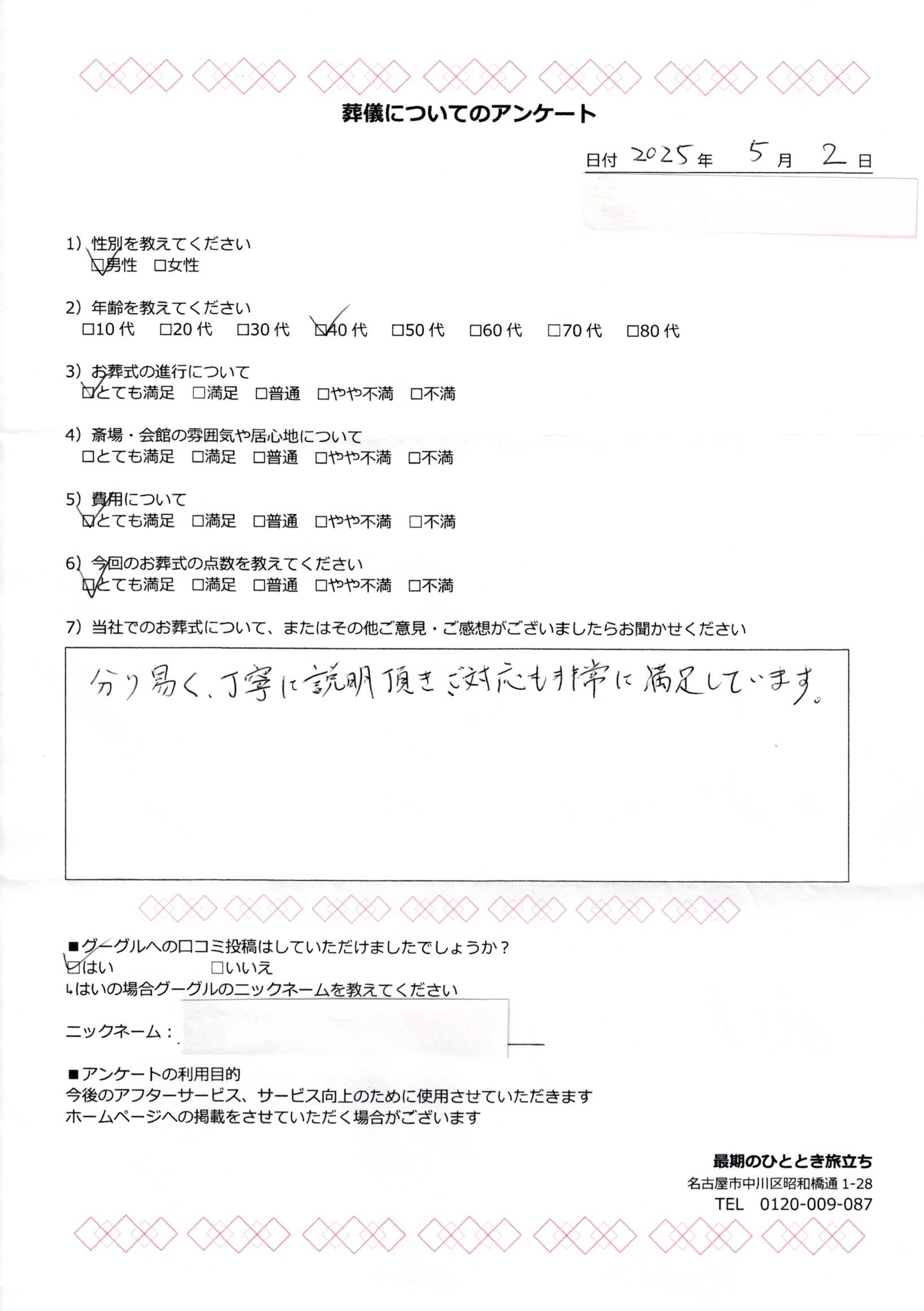 2025/05/13 59【千種区】40代男性 無料で今すぐ相談する 葬儀・家族葬に関する疑問やお悩みは、お気軽にご相談ください。 ご相談・お問合わせ・お見積もりは無料です。 最期のひととき旅立ちまでお気軽にお問い合わせください。 葬儀・家族葬のご相談はこちら >> 無料で今すぐ相談する 葬儀・家族葬に関する疑問やお悩みは、お気軽にご相談ください。 ご相談・お問合わせ・お見積もりは無料です。 最期のひととき旅立ちまでお気軽にお問い合わせください。 葬儀・家族葬のご相談はこちら >> ≪ひとつ古い記事へ