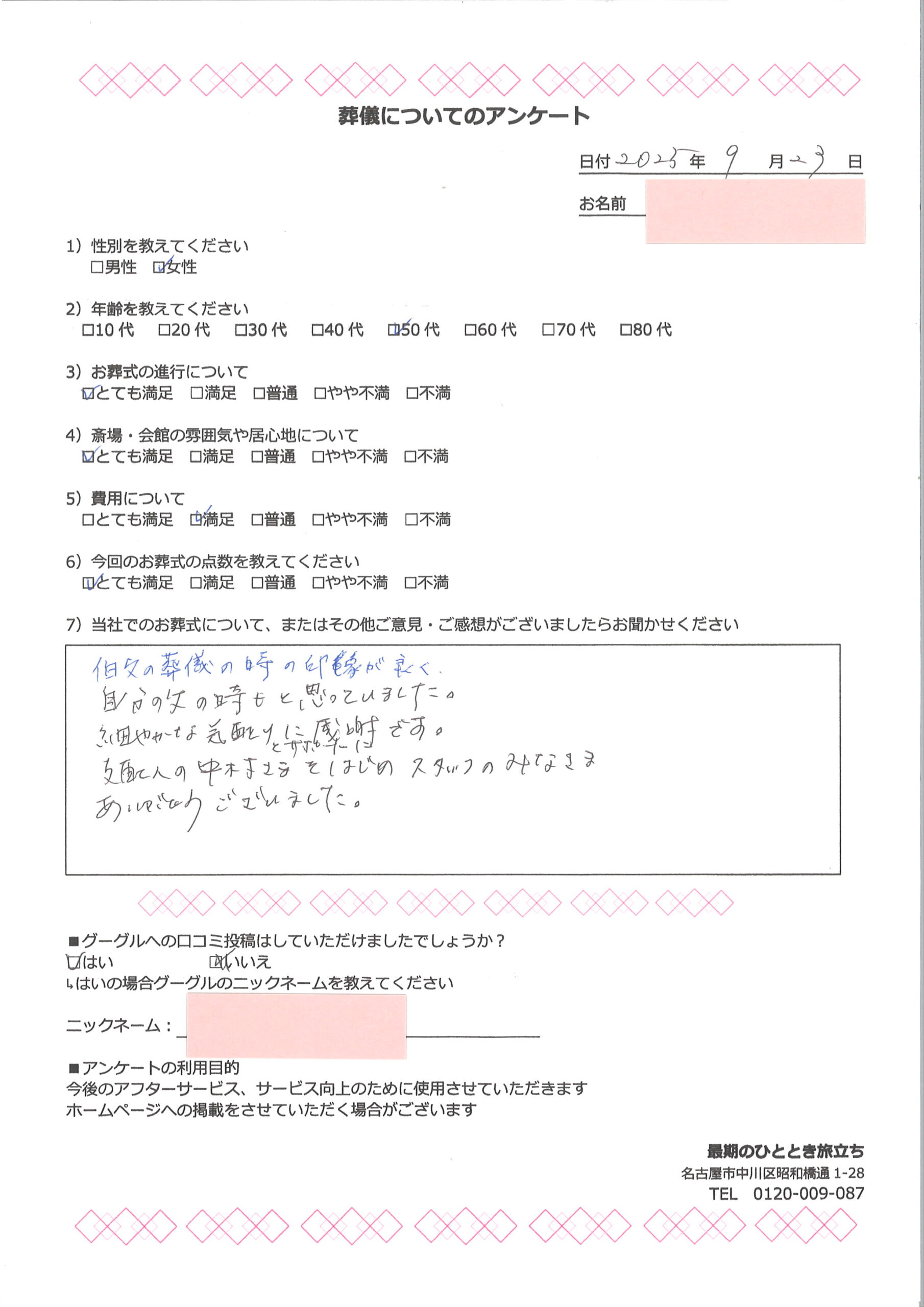 お客様の声 2025/12/16 【名古屋市】50代 女性 無料で今すぐ相談する 葬儀・家族葬に関する疑問やお悩みは、お気軽にご相談ください。 ご相談・お問合わせ・お見積もりは無料です。 最期のひととき旅立ちまでお気軽にお問い合わせください。 葬儀・家族葬のご相談はこちら >> 伯父の葬儀の時の印象が良く 自分の父の時もと思っていました。 細やかな気配りとサポートに感謝です。 支配人の中村さまをはじめスタッフのみなさま ありがとうございました。 無料で今すぐ相談する 葬儀・家族葬に関する疑問やお悩みは、お気軽にご相談ください。 ご相談・お問合わせ・お見積もりは無料です。 最期のひととき旅立ちまでお気軽にお問い合わせください。 葬儀・家族葬のご相談はこちら >> ≪ひとつ古い記事へ ひとつ新しい記事へ≫