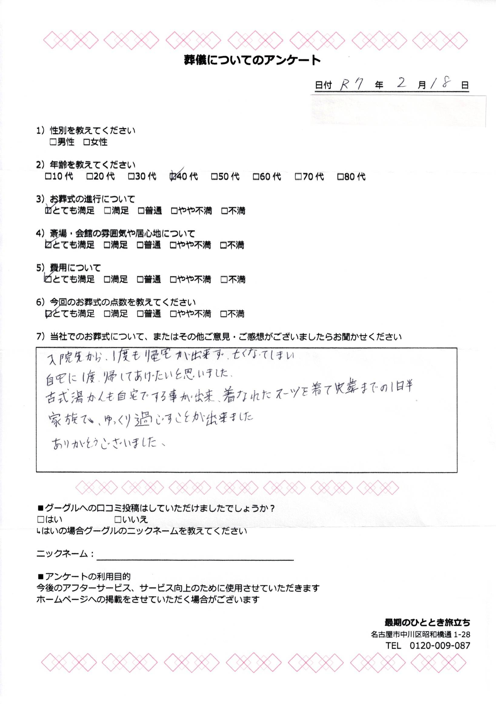 2025/04/29 49【天白区】40代女性 無料で今すぐ相談する 葬儀・家族葬に関する疑問やお悩みは、お気軽にご相談ください。 ご相談・お問合わせ・お見積もりは無料です。 最期のひととき旅立ちまでお気軽にお問い合わせください。 葬儀・家族葬のご相談はこちら >> 無料で今すぐ相談する 葬儀・家族葬に関する疑問やお悩みは、お気軽にご相談ください。 ご相談・お問合わせ・お見積もりは無料です。 最期のひととき旅立ちまでお気軽にお問い合わせください。 葬儀・家族葬のご相談はこちら >> ≪ひとつ古い記事へ