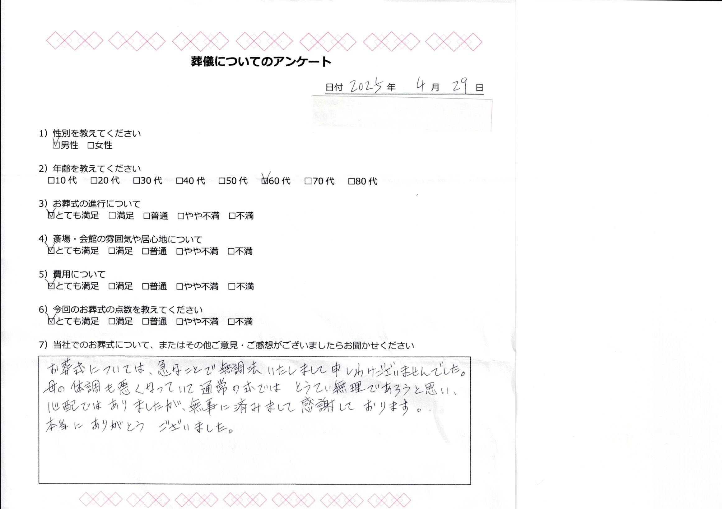 2025/05/06 58【岐阜県】60代男性 無料で今すぐ相談する 葬儀・家族葬に関する疑問やお悩みは、お気軽にご相談ください。 ご相談・お問合わせ・お見積もりは無料です。 最期のひととき旅立ちまでお気軽にお問い合わせください。 葬儀・家族葬のご相談はこちら >> 無料で今すぐ相談する 葬儀・家族葬に関する疑問やお悩みは、お気軽にご相談ください。 ご相談・お問合わせ・お見積もりは無料です。 最期のひととき旅立ちまでお気軽にお問い合わせください。 葬儀・家族葬のご相談はこちら >> ≪ひとつ古い記事へ