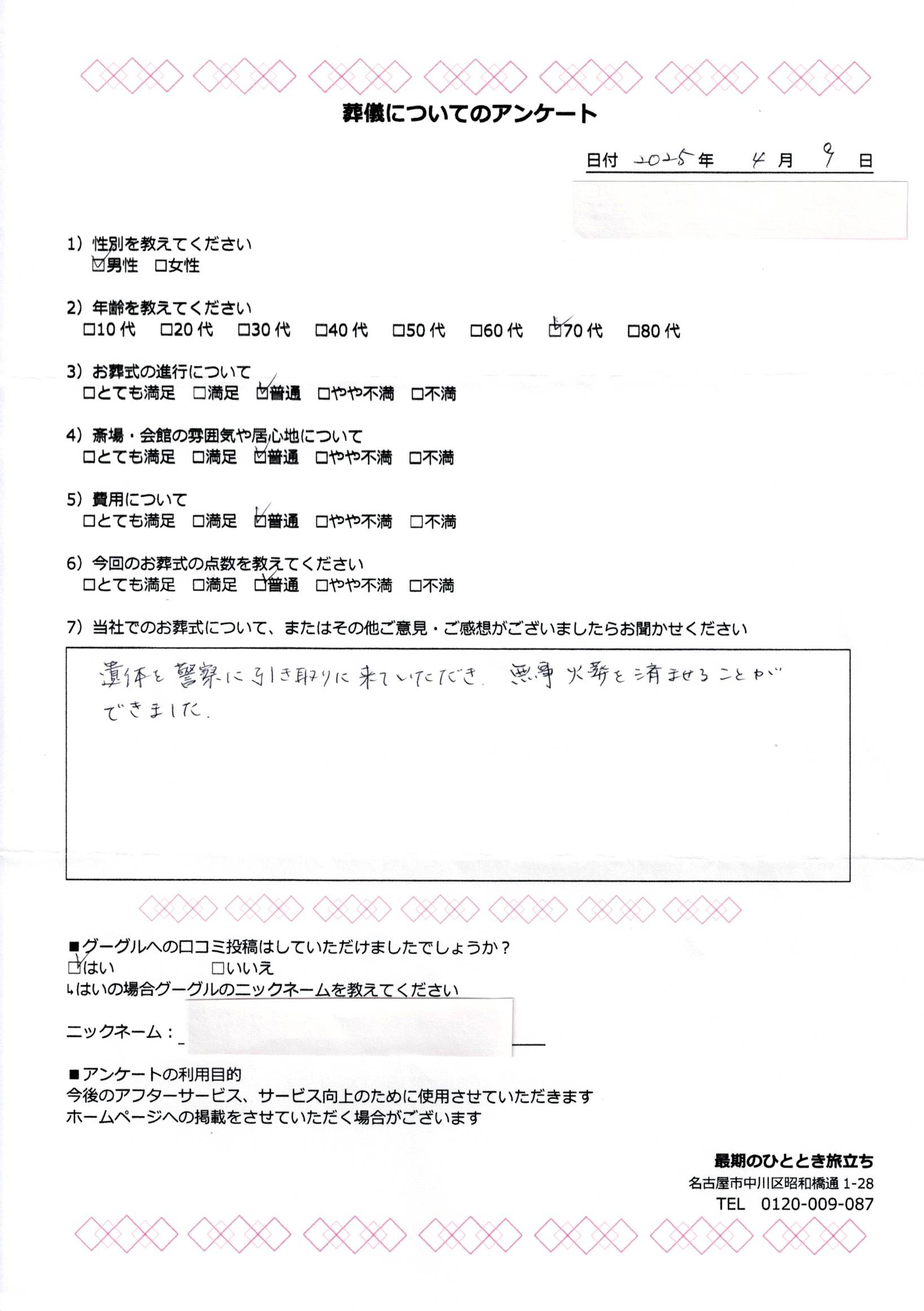 2025/04/29 53【昭和区】70代男性 無料で今すぐ相談する 葬儀・家族葬に関する疑問やお悩みは、お気軽にご相談ください。 ご相談・お問合わせ・お見積もりは無料です。 最期のひととき旅立ちまでお気軽にお問い合わせください。 葬儀・家族葬のご相談はこちら >> 無料で今すぐ相談する 葬儀・家族葬に関する疑問やお悩みは、お気軽にご相談ください。 ご相談・お問合わせ・お見積もりは無料です。 最期のひととき旅立ちまでお気軽にお問い合わせください。 葬儀・家族葬のご相談はこちら >> ≪ひとつ古い記事へ