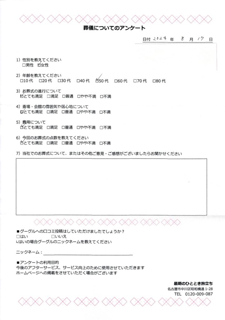 お客様の声 2025/04/08 【東京都】50代女性 無料で今すぐ相談する 葬儀・家族葬に関する疑問やお悩みは、お気軽にご相談ください。 ご相談・お問合わせ・お見積もりは無料です。 最期のひととき旅立ちまでお気軽にお問い合わせください。 葬儀・家族葬のご相談はこちら >> 無料で今すぐ相談する 葬儀・家族葬に関する疑問やお悩みは、お気軽にご相談ください。 ご相談・お問合わせ・お見積もりは無料です。 最期のひととき旅立ちまでお気軽にお問い合わせください。 葬儀・家族葬のご相談はこちら >> ≪ひとつ古い記事へ ひとつ新しい記事へ≫