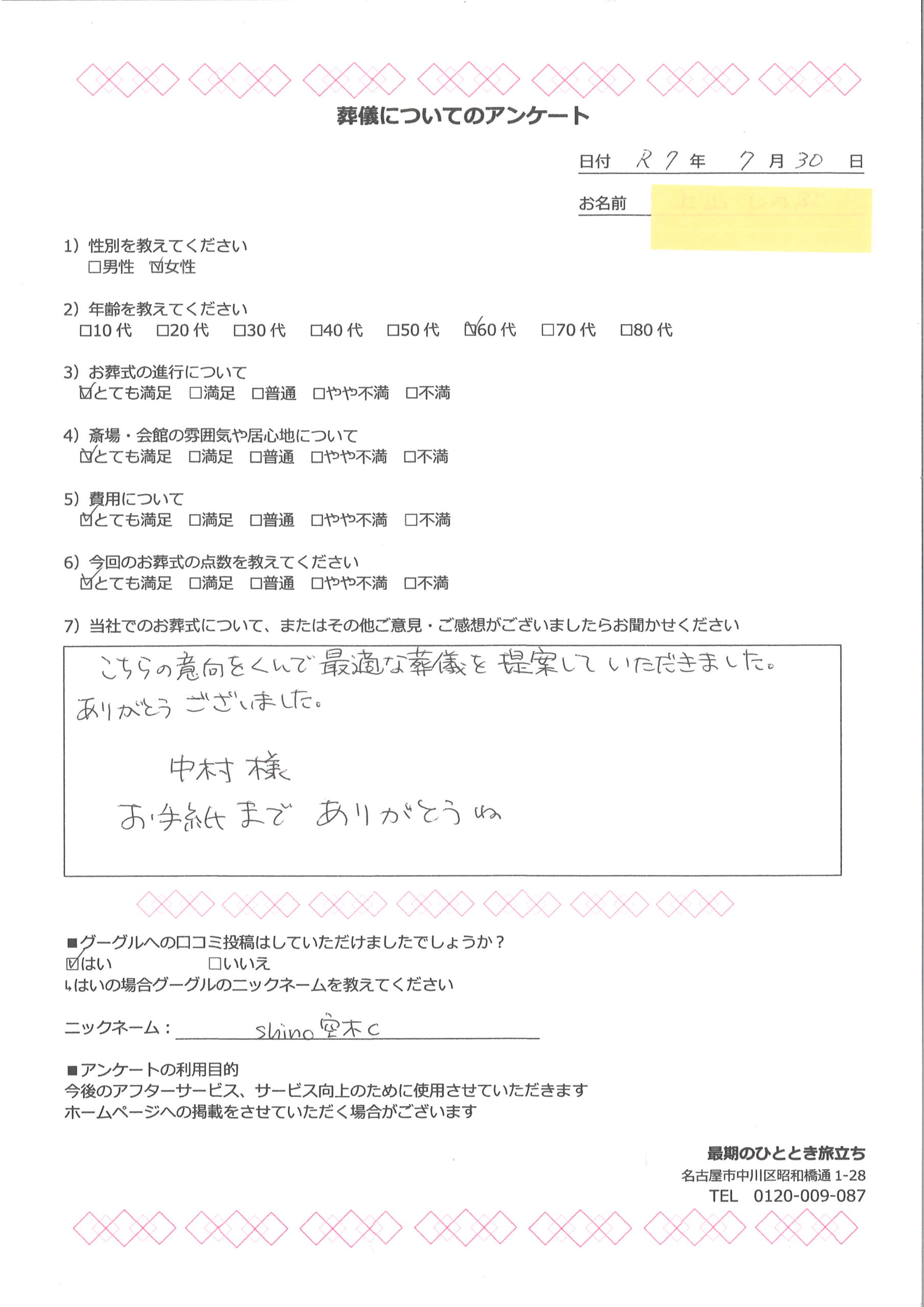 お客様の声 2025/10/07 【東京都 葛飾区】60代 男性 無料で今すぐ相談する 葬儀・家族葬に関する疑問やお悩みは、お気軽にご相談ください。 ご相談・お問合わせ・お見積もりは無料です。 最期のひととき旅立ちまでお気軽にお問い合わせください。 葬儀・家族葬のご相談はこちら >> こちらの意向をくんで 最適な葬儀を提案していただきました。 ありがとうございした。 中村様 お手紙までありがとうね 無料で今すぐ相談する 葬儀・家族葬に関する疑問やお悩みは、お気軽にご相談ください。 ご相談・お問合わせ・お見積もりは無料です。 最期のひととき旅立ちまでお気軽にお問い合わせください。 葬儀・家族葬のご相談はこちら >> ≪ひとつ古い記事へ ひとつ新しい記事へ≫