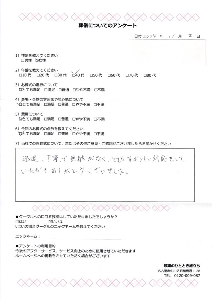 お客様の声 2025/04/15 【東区】40代女性 無料で今すぐ相談する 葬儀・家族葬に関する疑問やお悩みは、お気軽にご相談ください。 ご相談・お問合わせ・お見積もりは無料です。 最期のひととき旅立ちまでお気軽にお問い合わせください。 葬儀・家族葬のご相談はこちら >> 迅速、丁寧で無駄がなく、とてもすばらしい対応をしていただき、ありがとうございました。 無料で今すぐ相談する 葬儀・家族葬に関する疑問やお悩みは、お気軽にご相談ください。 ご相談・お問合わせ・お見積もりは無料です。 最期のひととき旅立ちまでお気軽にお問い合わせください。 葬儀・家族葬のご相談はこちら >> ≪ひとつ古い記事へ ひとつ新しい記事へ≫