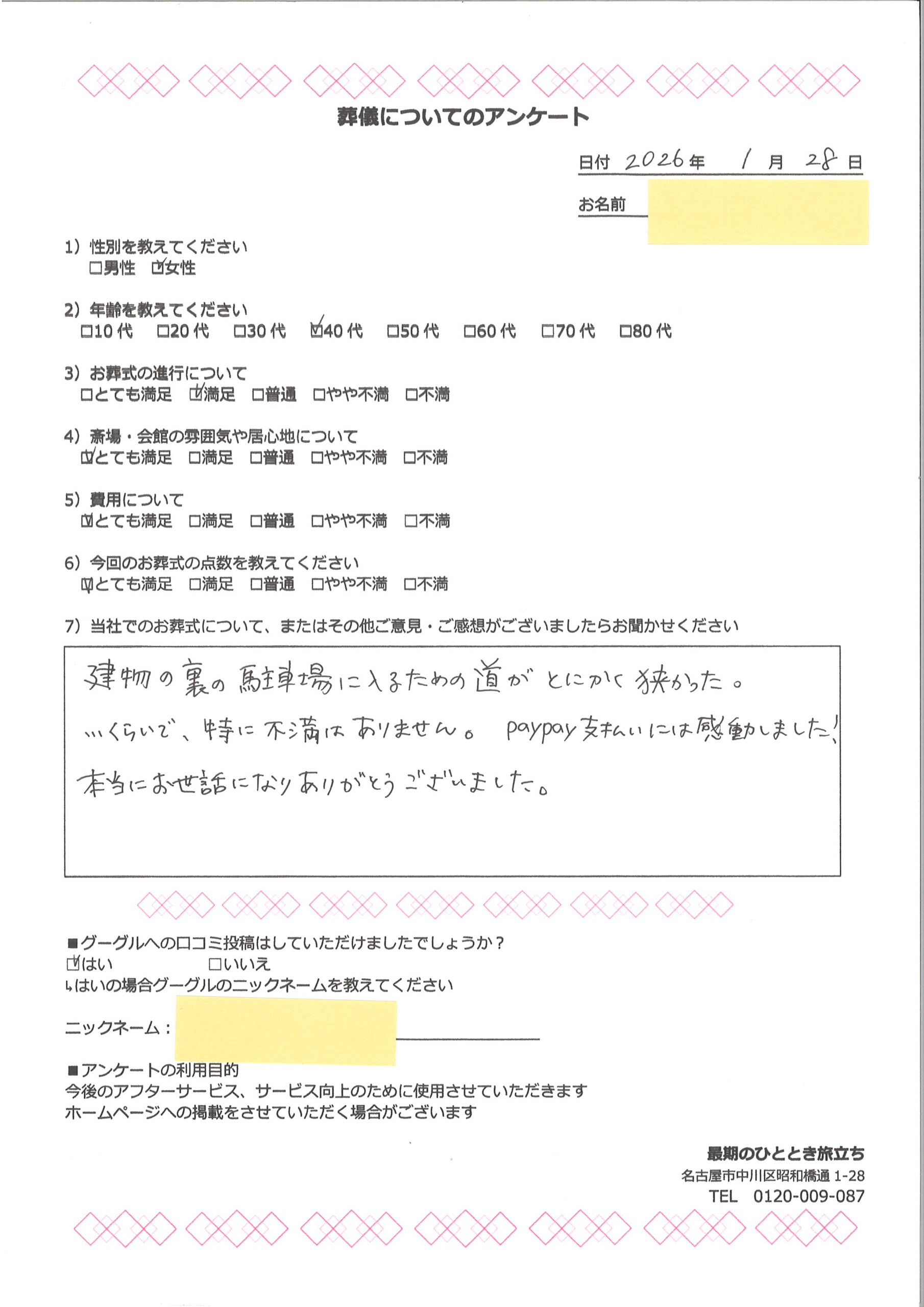 お客様の声 2026/02/13 【熱田区】40代女性 無料で今すぐ相談する 葬儀・家族葬に関する疑問やお悩みは、お気軽にご相談ください。 ご相談・お問合わせ・お見積もりは無料です。 最期のひととき旅立ちまでお気軽にお問い合わせください。 葬儀・家族葬のご相談はこちら >> 建物の裏の駐車場に入るための道がとにかく狭かった。 …くらいで、特に不満はありません。 PayPay支払いには感動しました! 本当にお世話になりありがとうございました。 無料で今すぐ相談する 葬儀・家族葬に関する疑問やお悩みは、お気軽にご相談ください。 ご相談・お問合わせ・お見積もりは無料です。 最期のひととき旅立ちまでお気軽にお問い合わせください。 葬儀・家族葬のご相談はこちら >> ≪ひとつ古い記事へ ひとつ新しい記事へ≫