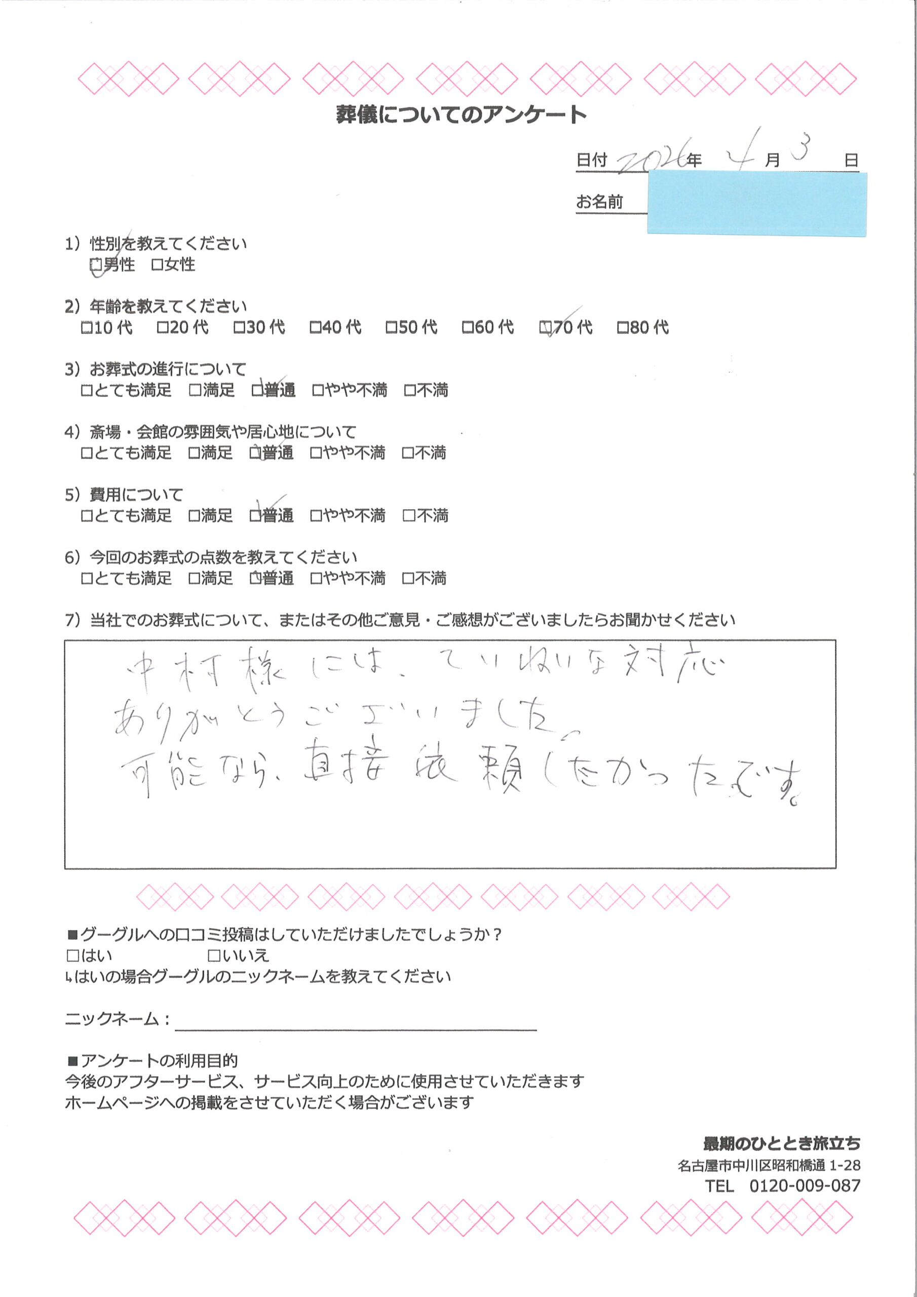 お客様の声 2026/04/20 【熱田区】70代男性 無料で今すぐ相談する 葬儀・家族葬に関する疑問やお悩みは、お気軽にご相談ください。 ご相談・お問合わせ・お見積もりは無料です。 最期のひととき旅立ちまでお気軽にお問い合わせください。 葬儀・家族葬のご相談はこちら >> 中村様には、ていねいな対応ありがとうございました。可能なら、直接依頼したかったです。 無料で今すぐ相談する 葬儀・家族葬に関する疑問やお悩みは、お気軽にご相談ください。 ご相談・お問合わせ・お見積もりは無料です。 最期のひととき旅立ちまでお気軽にお問い合わせください。 葬儀・家族葬のご相談はこちら >> ≪ひとつ古い記事へ ひとつ新しい記事へ≫