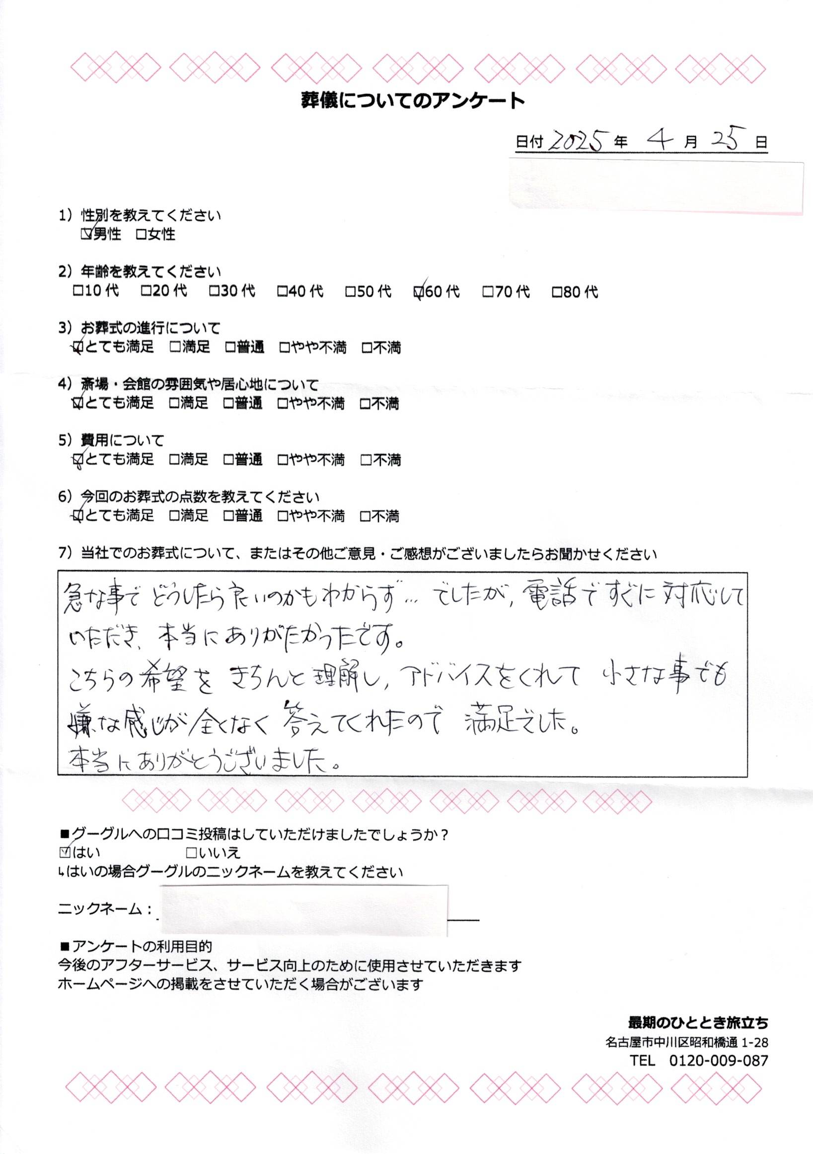 2025/04/29 57【稲沢市】60代男性 無料で今すぐ相談する 葬儀・家族葬に関する疑問やお悩みは、お気軽にご相談ください。 ご相談・お問合わせ・お見積もりは無料です。 最期のひととき旅立ちまでお気軽にお問い合わせください。 葬儀・家族葬のご相談はこちら >> 無料で今すぐ相談する 葬儀・家族葬に関する疑問やお悩みは、お気軽にご相談ください。 ご相談・お問合わせ・お見積もりは無料です。 最期のひととき旅立ちまでお気軽にお問い合わせください。 葬儀・家族葬のご相談はこちら >> ≪ひとつ古い記事へ