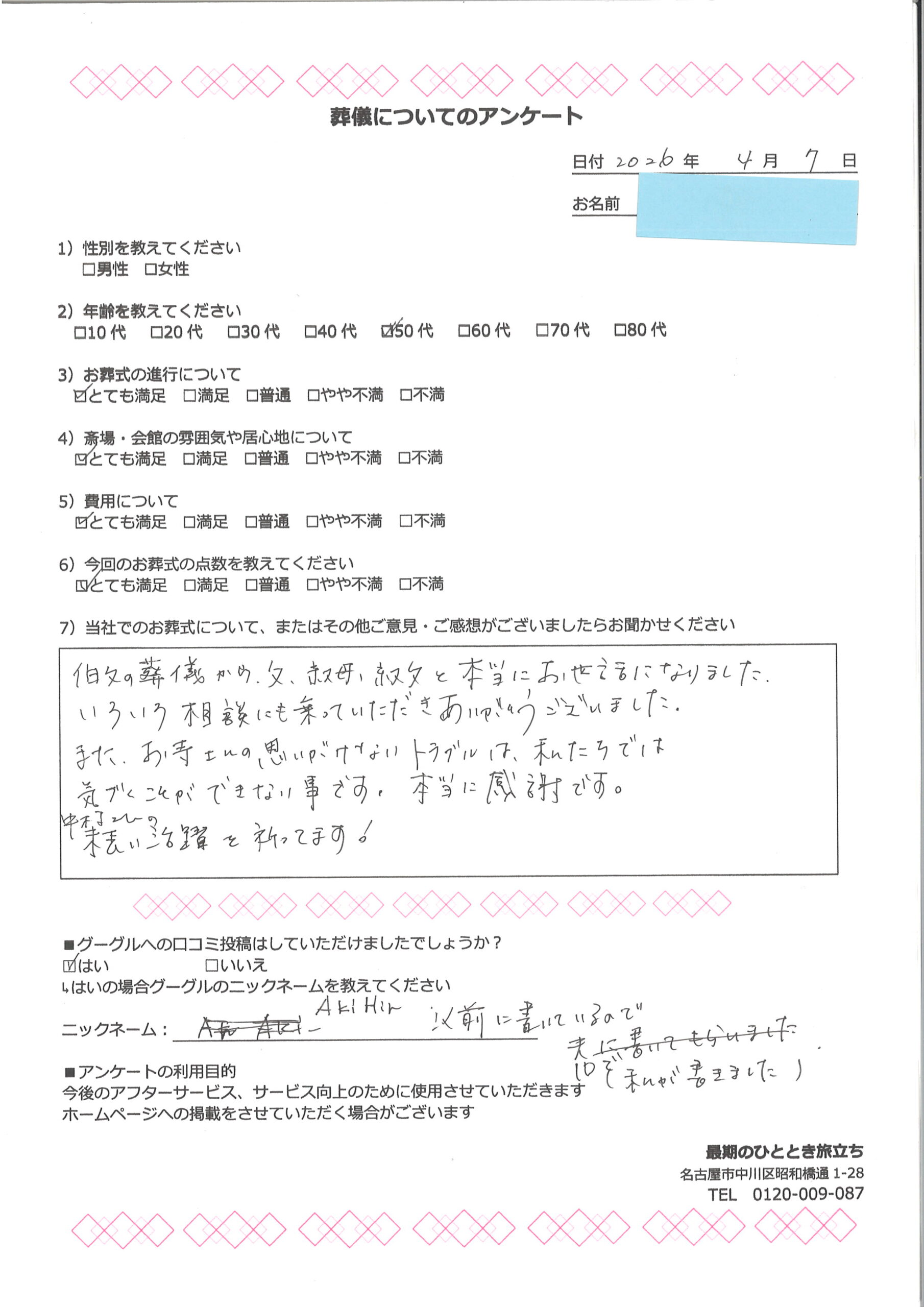 伯父の葬儀から、父、叔母、叔父と本当にお世話になりました。