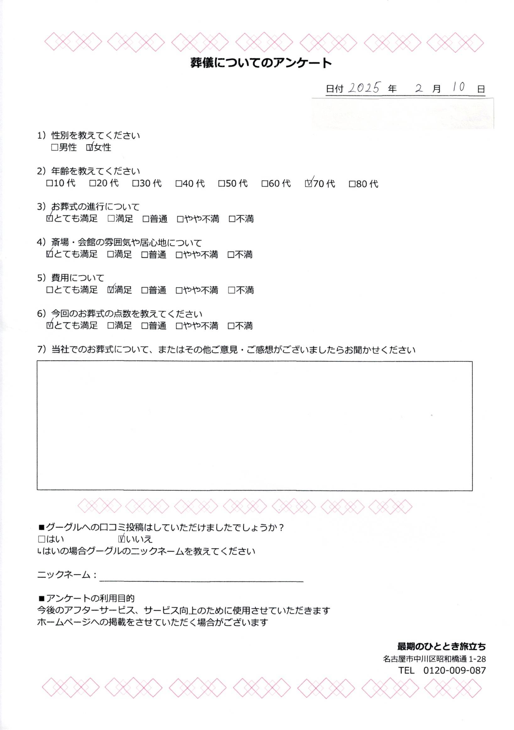 2025/04/29 中村区70代女性 無料で今すぐ相談する 葬儀・家族葬に関する疑問やお悩みは、お気軽にご相談ください。 ご相談・お問合わせ・お見積もりは無料です。 最期のひととき旅立ちまでお気軽にお問い合わせください。 葬儀・家族葬のご相談はこちら >> 無料で今すぐ相談する 葬儀・家族葬に関する疑問やお悩みは、お気軽にご相談ください。 ご相談・お問合わせ・お見積もりは無料です。 最期のひととき旅立ちまでお気軽にお問い合わせください。 葬儀・家族葬のご相談はこちら >> ≪ひとつ古い記事へ