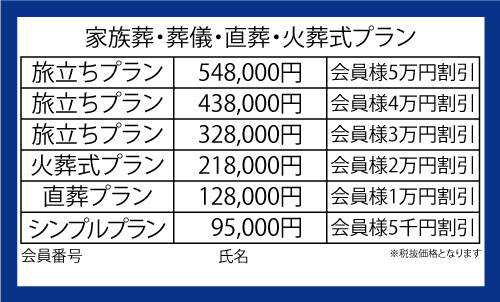 《旅立ち友の会》ご入会すると最大5万円の割引1.入会金無料 毎月の積立や年会費など必要ありません。2.ご葬儀のご依頼当日でも入会できます。3.ご登録者様の紹介であればご家族はもちろん、友人知人様でもご利用できます ≪会員特典≫ 旅立ちプランから会員割引を受けられます お位牌・お仏壇が会員価格にてご購入できます 旅立ち友の会のお申し込みは当施設までお問い合わせください。 メールでもお申込みできます。 >> お別れルーム旅立ちには大きなホールはありません。家族葬に適したお部屋でゆっくりお別れができます。 すべてのプランに家族葬や火葬式(直葬)に必要なものがすべて含まれています。 舜×旅立ち会館限定プラン 葬儀場代もお坊さんの費用もぜんぶ込み!葬儀斎場とお布施がセットになったシンプルなプランです。 旅立ち僧侶一日プラン≪327,800円税込≫ 詳しく見る 旅立ち僧侶二日プラン≪437,800円税込≫ 詳しく見る 旅立ちの直葬・火葬式プラン シンプル直葬 95,000円≪104,500円税込≫ 最も費用を抑えたシンプルプラン 故人様をお預かりご安置後、火葬場へお連れして火葬を行います面会はできませんが費用を抑えたい方におすすめです(祭壇/生花/遺影写真/枕飾り/白木位牌/白装束/後飾りは含まれません) 詳しく見る 直葬 128,000円≪140,800円税込≫ 最期のお別れができる直葬プラン 故人様をお預かりご安置後、火葬場へお連れして火葬を行います直葬であっても故人様と最期のお別れのお時間をご用意しております(御出棺前のお別れがあります/60分間)※祭壇/生花/遺影写真/白木位牌/後飾りは含まれません 詳しく見る 火葬式 218,000円≪239,800円税込≫ 24時間面会できるプラン お通夜・お葬式は行わないが24時間面会ができます最期のお別れをご家族でゆっくり大切に過ごしたい方へおすすめです(24時間出入り自由です/ご宿泊要相談ください)※生花/遺影写真/は含まれません 詳しく見る 「旅立ちの通夜・告別式・初七日法要」追加費用の掛からない3つの安心プラン 旅立ち328,000円プラン≪360,800円税込≫ 詳しく見る 旅立ち438,000円プラン≪481,800円税込≫ 詳しく見る 旅立ち548,000円プラン≪602,800円税込≫ 詳しく見る 旅立ちの民生葬プラン 旅立ちの民生葬 0円≪0円税込≫ 民生葬プラン 生活保護を受給されている方のみが実質の自己負担無で受けられる制度、葬祭扶助制度が適応されれば必要最小限のお葬式を執り行います。 詳しく見る ルーム使用のみ 24時間 26,400円(税込)延長料金 1時間毎2,640円(税込)全6室 冷暖房完備・宿泊施設 冷蔵庫・霊安室へのご安置ではありませんのでいつでも故人様とお会いできます。 各種オプション価格一覧(税込み価格表記) それぞれのプランに必要なものは含まれておりますが、もうワンランク上の「お別れ」を望まれる方には、下記オプションもご用意しております。 供花・供物のお申込みはこちらのフォームからお申込みいただけます。 供花・供物のお申込みはこちらのフォームからお申込みいただけます。 メイク処置納棺66,000円 ご洗体湯かん110,000円 枕花16,500円 枕花(胡蝶蘭入り)19,800円 枕花(胡蝶蘭入り)33,000円 枕花 胡蝶蘭60,500円 お別れ花22,000円~ お供え花3点セット27,500円 果物かご(小)19,800円 果物かご(中)25,300円 果物かご(大)30,800円 花束(小)5,500円 花束(中)11,000円 花束(大)16,500円 お供えキャンドル9,900円 返礼品880円~ 寝台車(20km)38,500円 ドライアイス13,200円 遺影写真(大)18,700円 お棺サイズアップ27,500円 お食事1,650円~ セレモニースタッフ27,500円~ 式場使用料(延長1時間)2,640円 お部屋の追加(1部屋)13,200円 エンバーミング275,000円~ マイクロバス66,000円 メイク処置納棺66,000円 ご洗体湯かん110,000円 枕花16,500円 枕花(胡蝶蘭入り)19,800円 枕花(胡蝶蘭入り)33,000円 枕花 胡蝶蘭60,500円 お別れ花22,000円~ お供え花3点セット27,500円 果物かご(小)19,800円 果物かご(中)25,300円 果物かご(大)30,800円 花束(小)5,500円 花束(中)11,000円 花束(大)16,500円 お供えキャンドル9,900円 返礼品880円~ 寝台車(20km)38,500円 ドライアイス13,200円 遺影写真(大)18,700円 お棺サイズアップ27,500円 お食事1,650円~ セレモニースタッフ27,500円~ 式場使用料(延長1時間)2,640円 お部屋の追加(1部屋)13,200円 エンバーミング275,000円~ マイクロバス66,000円 枕花16,500円 果物かご(大)30,800円 果物かご(小)19,800円 お坊さん手配 お経、法名、戒名、法要などご相談ください。 お坊さん(お経)45,000円~ 法要(ルーム使用料)33,000円~ 法名・戒名5,000円~ 永代供養(八事霊園・平和公園)35,000円~ お坊さん 宗派 内容 お布施(税込) お坊さん 無し 民生(実質0円) プラン込み 無し 炉前(火葬場にて) 45,000円 出棺前(旅立ち会館にて) 45,000円 1日葬/告別式・初七日 95,000円 2日葬/通夜・告別式・初七日 155,000円 お坊さん 宗派あり 炉前(火葬場にて) 45,000円 出棺前(旅立ち会館にて) 45,000円 1日葬/告別式・初七日 125,000円 2日葬/通夜・告別式・初七日 225,000円 お坊さん 日蓮宗 事前確認 275,000円~ 臨済宗 事前確認 275,000円~ 真言宗 事前確認 275,000円~ 法名 5,000円~ 戒名 10,000円~ 法要 30,000円 